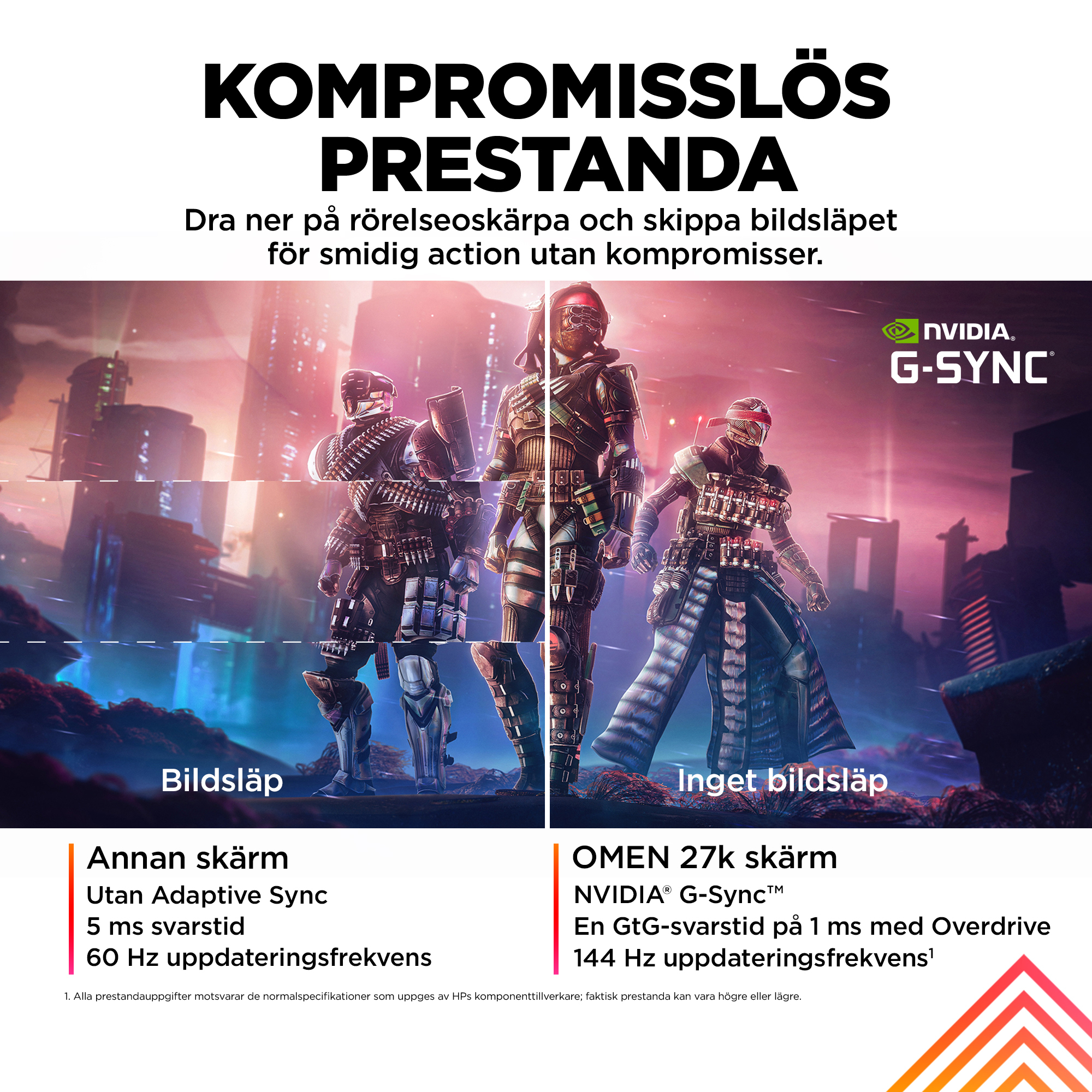 Upplev all action utan kompromisser, en bildruta åt gången – även med enastående 4K-grafik<sup>[1]</sup>. Varje rörelse och pixel är perfekt med snabb svarstid på 1 ms och en uppdateringsfrekvens på 144 Hz <sup>[3]</sup>. Låt bildsläp och lagg vara ett minne blott tack vare NVIDIA® G-SYNC®-kompatibilitet.